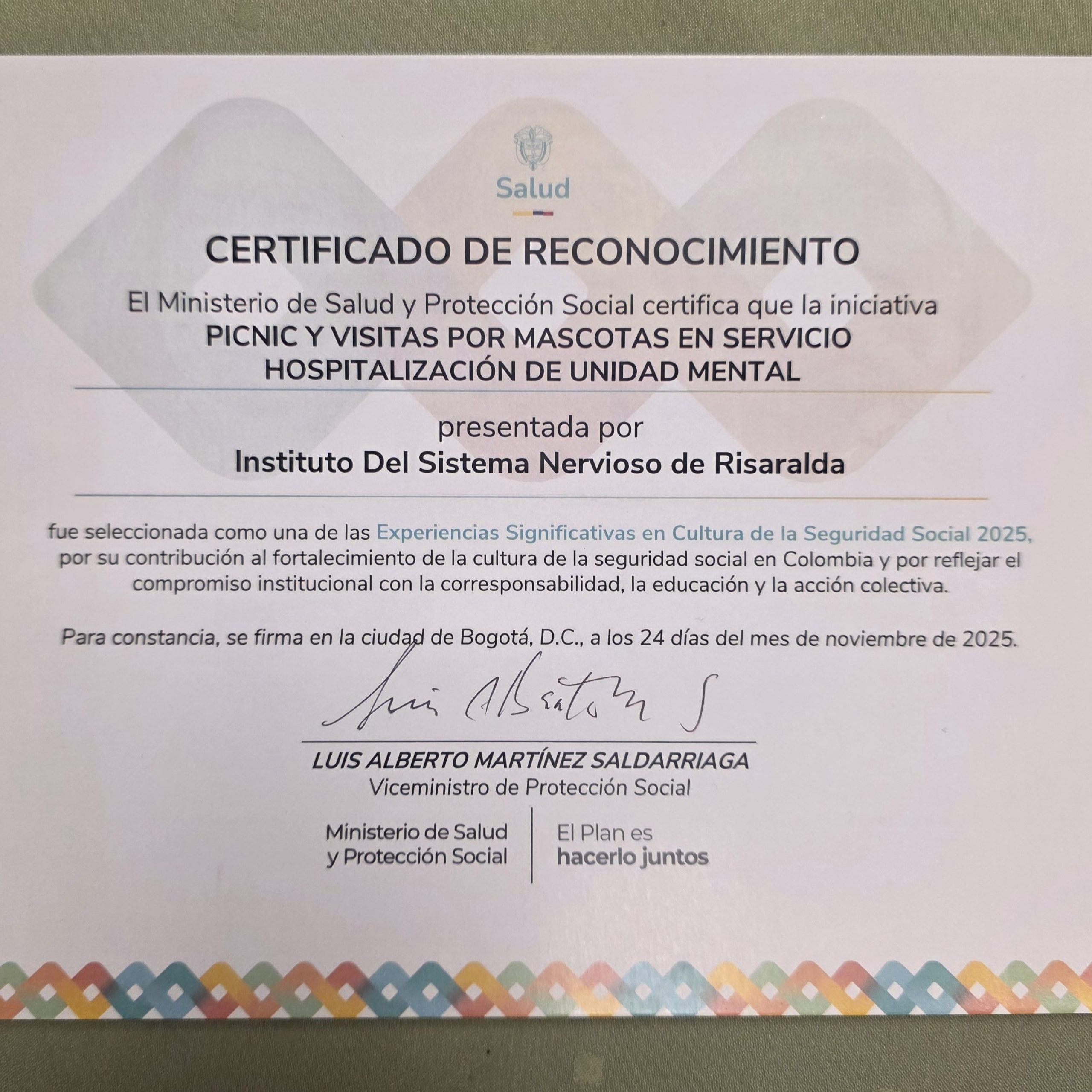 Esta estrategia humanizada implementada por el Instituto del Sistema Nervioso del Risaralda fue selecciona por el Ministerio de Salud y Protección Social entre más de 100 postulaciones como una de las EXPERIENCIAS SIGNIFICATIVAS EN CULTURA DE LA SEGURIDAD SOCIAL 2025 para conformar la caja de herramientas de la Cultura de la Seguridad Social.